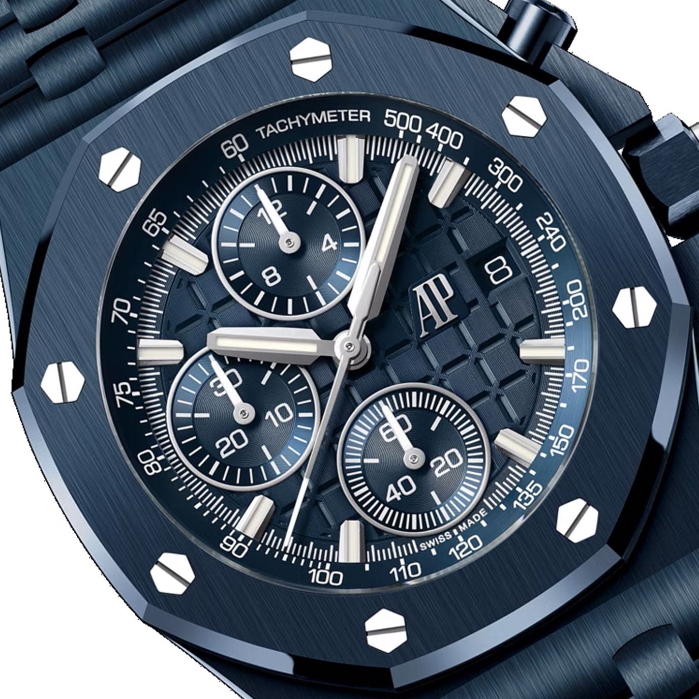 The Audemars Piguet Royal Oak Offshore Selfwinding Chronograph 42 mm in full blue ceramic is a bold and contemporary reimagining of a modern icon. Crafted entirely from lightweight, scratch-resistant ceramic, this timepiece features a monochromatic aesthetic with a smoked blue “Méga Tapisserie” dial, matching counters, and white gold hour-markers and hands. Powered by the latest selfwinding Calibre 4404 with an integrated chronograph and flyback function, this model also boasts a transparent sapphire caseback revealing the refined finishing of the in-house movement. Designed for performance and presence, it merges high-tech materials with mechanical excellence and unmistakable Royal Oak Offshore DNA.