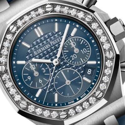 Unworn Audemars Piguet Royal Oak Offshore SELFWINDING CHRONOGRAPH 26231ST.ZZ.D027CA.01. 37 mm, Blue dial with “Lady Tapisserie” pattern, blue counters, blue external zone, white gold applied hour-markers and Royal Oak hands with luminescent coating, Stainless steel case, glareproofed sapphire crystal, diamond-set bezel, stainless steel pushpieces and screw-locked crown, 2385 calibre, Selfwinding movement, 40 h power reserve, 37 jewels, Blue rubber strap with AP folding clasp. Water resistant to 50 m.
