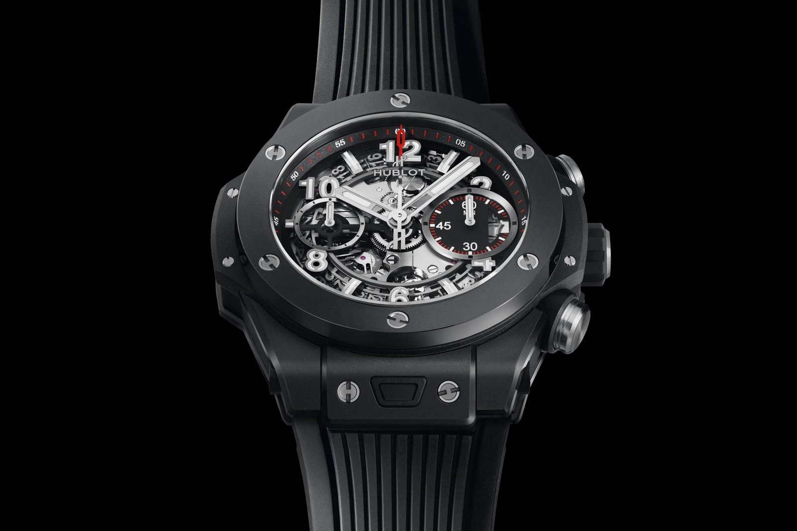 Hublot Big Bang Unico Black Magic, 42mm watch, black ceramic case, satin/brushed finished with fine polished corners, Reference 441.CI.1170.RX. This model has Sapphire crystal transparent dial. Applied applique style Arabic numerals and index hour markers with luminous fill. Black dial flange with a minute/seconds track. Bold brushed finished hands with luminous fill (minutes and hours hands semi-skeleton). Small running seconds sub-dial hand located at the 9 o’clock position. Date window located between the 3 o’clock positions. Screw-down crown. The dial closed by a Scratch-resistant Sapphire Crystal with Anti-reflective Treatment. Of Sapphire Crystal made transparent case back. Chronograph stopwatch functions: column wheel chronograph mechanism; features a Flyback function, which allows instant restarting of the chronograph with a single push of the button; large central seconds counter with the “H” logo as a counter-weight; 60-minute counter sub-dial at 3 o’clock. The watch is equipped fixed black ceramic bezel, secured 6 immediately recognizable Hublots signature “H” screws style of Titanium. The watch is Hublot Caliber HUB 1280 UNICO Manufacture Self-winding Chronograph Flyback Movement with Column Wheel automatic movement, contains 43 Jewels and has an approximate power reserve of 72 hours. This model presented on a Black Structured Rubber Strap with Black Ceramic and Black-plated Titanium Deployant Buckle Clasp. The water resistance is up to 100m/330ft (10 ATM).