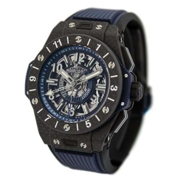 Hublot Big Bang Unico GMT Carbon, 45mm watch. Black carbon fiber case, Reference 471.QX.7127.RX. This model has Skeleton blue and matte black dial with applied applique style alternating silver-tone Arabic numerals and index hour markers with luminous fill. Blue composite resin lower bezel. Blue dial flange with a silver-tone minute/seconds track. White Arabic numeral minute markers at 5-minute interval. Bold Silver-tone brushed finished hands with luminous fill (minutes and hours hands semi-skeleton). Blue tipped central seconds hand. Screw-down Black titanium crown with black rubber around the crown for enhanced grip. The dial closed by a Scratch-resistant Sapphire Crystal with Anti-reflective Treatment. Of Sapphire Crystal made transparent case back. GMT Time zone Function: engraved 12 hour markings on the bezel; central GMT hand: Skeletonized with luminous filled arrow-head; corresponding night/day zone ring in blue and grey at the dial center; buttons at 2 and 4 o’clock advance and reverse the time in 1 hour increments. The watch is equipped fixed Black carbon fiber bezel, secured 6 immediately recognizable Hublots signature “H” screws style of Titanium. The watch is Hublot in-house manufacture Caliber UNICO HUB1251 contains 41 Jewels and has an approximate power reserve of 72 hours. This model presented on a Blue and black Structured Lined Rubber Strap with Carbon fiber Deployant Buckle Clasp. Straps are easily interchangeable via a unique quick-release push-button system developed by Hublot. The buttons are located on the top & bottom central lugs (this watch is delivered with a single strap only). The water resistance is up to 100m/330ft (10 ATM).