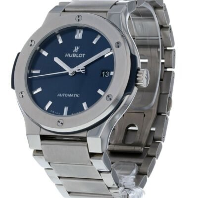 Hublot Classic Fusion Automatic 45mm watch, Grey Satin-finished and polished titanium case with brushed finished top and bottom center links between the lugs, Reference 510.NX.7170.NX. This model has Satin-finished Blue Sunray dial with silver-tone polished rhodium plated hands and applied rhodium plated index hour markers. Date window located the 3 o’clock positions. Polished titanium crown with Pull / Press function. It has the Hublot logo engraved on it. The dial closed by a Scratch-resistant Sapphire Crystal with Anti-reflective Treatment. Of Sapphire Crystal transparent case back made. The watch is equipped fixed satin-finished and polished Grey Titanium bezel with a brushed finished top and polished finished beveled edge, secured with 6 polished “H” style titanium screws. Blue composite resin “bezel lug” sandwiched between the bezel and case. The watch is self-winding mechanical Hublot Caliber HUB1112, contains 25 Jewels and has an approximate power reserve of 42 hours. This model presented on a Satin-finished and Polished Titanium Bracelet with Titanium Deployant Buckle Clasp. The water resistance is up to 50m/150ft (5 ATM).