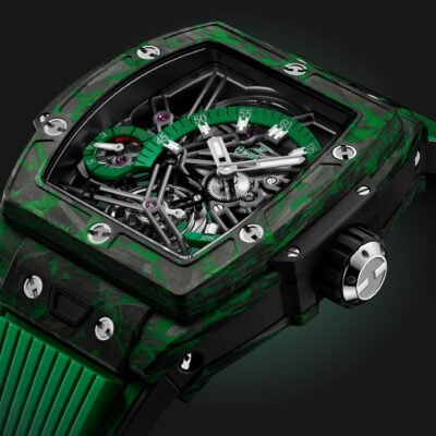 Unworn Hublot Spirit of Big Bang TOURBILLON CARBON GREEN 645.QG.5217.RX. 42 mm, Sapphire Crystal dial, Carbon Fiber with Green Micro-glass Fibers case, Sapphire with Anti-reflective Treatment crystal, Carbon Fiber with Green Micro-glass Fibers bezel, HUB6020 calibre, Manufacture Manual-winding Power Reserve Skeleton Tourbillon Movement, 115 Hours power reserve, Black and Green Structured Lined Rubber Straps with Titanium Deployant Buckle Clasp. Water resistant to 100 m.