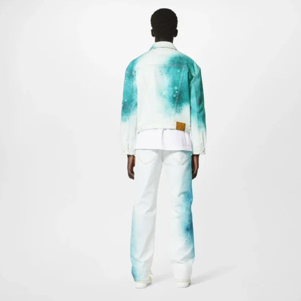 This denim jacket is distinguished with a tie-dye-inspired LV Spray motif in a bright seasonal green, through which contrasting white Monogram signatures emerge. This standout piece has a boxy fit with dropped shoulders and has been stone-washed for a soft finish. An LV jacqueron adds a final signature.