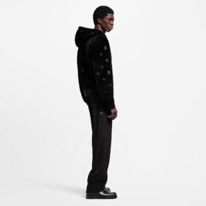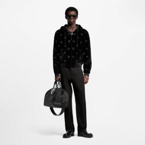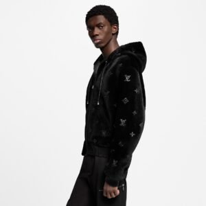 The modern dandy aesthetic of the Spring-Summer 2025 show imbues this luxurious zippered hoodie, elevating a classic casual silhouette into a chic and sensuous evening layer. Drawing on Louis Vuitton savoir-faire, it is crafted from black lamb shearling that has been trimmed for an ultra-soft finish, while an embroidered rhinestone Monogram motif adds glittering embellishment all over.