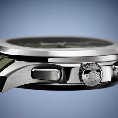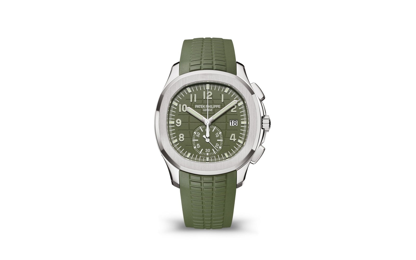 New Patek Philippe Aquanaut Chronograph luxury sports watch, 42,2mm, 18k White Gold, Ref. 5968G-010. The first chronograph with a flyback function in the modern Aquanaut sports collection, which perfectly matches the character of this young and dynamic watch line. His 18k White Gold rounded, pillow-like octagon-shaped case and gently curved ears are unmistakable. On a beautiful Khaki green dial with embossed embossing, perfectly readable large applied polished Arabic numerals made of 18k White Gold with luminescent coating in the form of hour markers look harmoniously. The manufacturer paid special attention to the second track on the outer rim of the dial. She is applied in long and short silvery lines with fairly wide luminous marks located every 5 minutes. Large polished luminous hour and minute hands in 18k White Gold indicate the time. These are complemented by a slim and elegant chronograph second hand (Sweep seconds hand). At the 6 o’clock position, there is a recessed green auxiliary chronograph counter with reverse movement repeating which follows the rounded octagonal shape of the bezel. It has glowing white Arabic numerals, white markers, and a white indicator needle. The date window is traditionally at the 3 o’clock position. Rectangular 18k White Gold buttons located on the right side of the case control the chronograph. At the 8 o’clock, position on the case is an instant date corrector. A polished 18k White Gold screw-down crown with a ribbed edge for a comfortable grip and the Patek Philippe logo is the finishing touch to the perfect picture. The dial is covered with a scratch-resistant sapphire crystal. The screw-down case back is also made of sapphire crystal, which allows you to see the magical work of the movement. Against this backdrop, a flat, fixed bezel in 18k White Gold, vertically ground on the front and polished on the sides, provides a wide view of the dial. The finish on the side of the bezel is amazing because at first glance, it looks rounded, but upon closer inspection, you can see the crisp edges playing with the light. The model is equipped with a Patek Philippe caliber CH 28‑520 C with a self-winding mechanical movement containing 32 jewels and a power reserve of min. 45 hours – max. 55 hours. This beautiful sport chic watch is presented on a Khaki green tropical rubber strap. This new composite material is highly resistant to wear, salt water and UV radiation. The strap are fastens with Patek Philippe’s patented 18k White Gold folding clasp, polished and engraved with the Calatrava cross. Opening the clasp reveals the engraved Patek Philippe logo with the word GENEVE. Water resistant up to 120m/394ft (12 ATM).