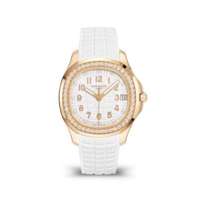 New Patek Philippe Aquanaut Luce luxury Ladies watch, with a larger diameter 38,8mm, 18k Rose Gold, Ref. 5268/200R-001. The automatic wristwatch in the modern Aquanaut sports collection, which perfectly matches the character of this young and dynamic watch line. It has rounded octagonal 18k Rose Gold body and gently curved lugs, with polished flat surfaces and satin-finish sides are unmistakable. On a beautiful Matte white dial with embossed “Aquanaut” harmoniously looks perfectly readable large applied polished Arabic numerals made of 18k Rose Gold with luminescent coating in the form of hour markers. The manufacturer paid special attention to the second track on the outer rim of the dial, on which applied rose gold tones lines with fairly wide luminous marks located every 5 minutes. Large polished luminous hour and minute hands in 18k Rose Gold indicate the time. These are complemented by a slim and elegant 18k Rose Gold second hand (Sweep seconds hand). The presence of a stop-seconds device, which stops the balance when the crown is pulled out, enables the user to set the time to the second. The date window is traditionally at the 3 o’clock position. A polished 18k Rose Gold screw-down crown with a ribbed edge for a comfortable grip and the Patek Philippe logo is the finishing touch to the perfect picture. The dial is covered with a scratch-resistant sapphire crystal. The screw-down case back is also made of sapphire crystal, which allows you to see the magical work of the movement and flawless hand-finish. The elegant highlight of this model is the fixed sparkling 18k Rose Gold bezel set with 48 Top Wesselton Pure diamonds (~1.11 ct) set with textbook precision with polished on the sides. The finish on the side of the bezel is amazing because at first glance, it looks rounded, but upon closer inspection, you can see the crisp edges playing with the light. The model is equipped with a Patek Philippe caliber 26‑330 S C with a self-winding mechanical movement containing 30 jewels and a power reserve of min. 35 hours – max. 45 hours. This beautiful sport chic watch is presented on an Integrated Matt-white strap that continues the visual harmony of the design made of Composite material. He is highly resistant to wear, salt water and UV radiation. The strap are fastens with Patek Philippe’s patented 18k Rose Gold folding clasp, polished and engraved with the Calatrava cross. Opening the clasp reveals the engraved Patek Philippe logo with the word GENEVE. Water resistant up to 120m/394ft (12 ATM).