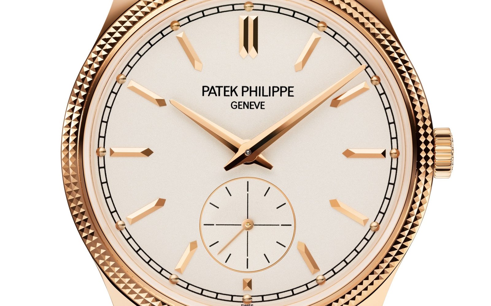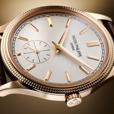 Luxury Patek Philippe Calatrava, 18k Rose Gold, 39mm and Reference 6119R-001. Their distinguishing feature is a Silvery grained dial with a applied 18k Rose Gold faceted hour markers in the shape of boats and hour markers with 18k Rose Gold dots on a black minute scale around the perimeter in a railway style look stylish on it. The dauphin sword-shaped hour and minute hands in 18K Rose Gold, as well as the recessed gray small sub-dial with a permanent second hand with black markers and a gold indicator hand, are spectacular. A polished 18k Rose Gold Screw-down crown with a ribbed edge for easy grip and the Patek Philippe logo is located on the right side of the case. The dial closed by a Scratch-resistant Sapphire Crystal and sapphire-crystal case back which allows of the case, allows you to see the magical work of the movement. The watch features the recognizable polished downward-turning lugs and the bezel fixed in 18K Rose Gold with a guilloche “Clous de Paris” pattern in the form of double-row stepped jagged nails. The watch Patek Philippe Caliber 30‑255 PS mechanical manually wound movement, containing 27 Jewels, and has a power reserve of 65 hours. This model, presented on is on shiny chocolate brown Alligator leather strap with square scales and hand-stitched. It zips up 18k Rose Gold Prong buckle. The water resistance is up to 30m/100ft (3 ATM).
