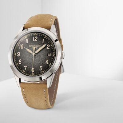 Luxury Patek Philippe Calatrava polished 18k White Gold, 40mm, Reference 5226G-001 wears extremely sporty, and with a slightly military look. The sides of the case are adorning the flanks with a Clous de Paris hobnail pattern typical of the Manufacture and the dial is decorated in a vintage style inspired by old cameras. This model has dial is textured charcoal gray with a black gradient rim.  On him looks spectacular overhead Arabic numerals with beige luminescent coating, vintage syringe hands  polished 18k White Gold hands and a gradient black minute track with Arabic numerals marking every 5-minute interval that adds instrumental precision to the overall look. In addition, this model is equipped with a spectacular second hand and an aperture-type date at the 3 o’clock position, and stop-seconds mechanism. A polished 18k White Gold crown with a ribbed edge for easy grip and the Patek Philippe logo is located on the right side of the case. The dial closed by a Scratch-resistant Sapphire Crystal and sapphire-crystal case back which allows of the case, allows you to see the magical work of the movement. The watch features an 18K White Gold fixed polished smooth bezel. This model has caliber Patek Philippe Caliber 26‑330 S C, a self-winding mechanical movement containing 30 precious stones, with a power reserve of min. 35 hours – max. 45 hours. This new reference is teamed with two interchangeable straps: one in beige calfskin with a nubuck finish —fitted on the watch— and the other in black calfskin with an embossed fabric motif and beige topstitching that is included with the watch. The straps come with 18k White Gold Prong buckles. The water resistance is up to 30m/100ft (3 ATM).