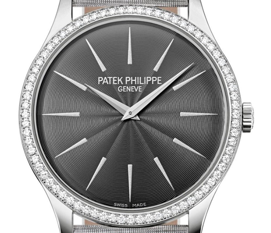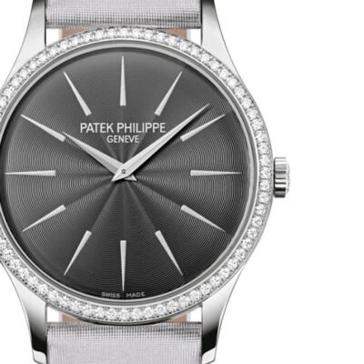 Introducing the Patek Philippe Calatrava 4897G-010, an emblem of elegance and a hallmark of the Patek Philippe style. Renowned for its pure lines, the Calatrava is celebrated as the quintessence of the round wristwatch, captivating watch enthusiasts across generations with its timeless, understated perfection. This model features a mechanical manually wound movement, the Caliber 215, housed within a 33mm white gold case. The case is a mere 6.6mm in height, demonstrating the sophistication of its sleek design. The guilloched silvery gray dial is complemented by powdered gold hour markers, creating a refined aesthetic. The bezel of the watch is adorned with 72 diamonds, totaling approximately 0.47 carats, adding a touch of brilliance to its elegant profile. This gem setting enhances the watch’s luxurious appeal, making it a stunning piece for any occasion. A silvery gray brushed satin strap completes the ensemble, providing a comfortable fit and a seamless look with its prong buckle. The watch also boasts a sapphire-crystal case back and water resistance up to 30 meters, ensuring durability alongside its exquisite craftsmanship.