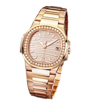 Ladies Watch Patek Philippe Nautilus Quartz Diamond 18k Rose Gold case, 32mm, Reference 7010/1R-012- has been the standard in luxury, because combine elegance, sporty style and timeless design. Is striking watch boasts a Golden with horizontally embossed dial, 18k Rose Gold applied hour markers and Arabic numerals at the 6 and 12 o’clock positioning a luminescent coating for easy readability in dim lighting as well as Dot minute markers around the outer rim. The sweep seconds hand and date in an aperture features at the 3 o’clock positioning give this model a clean profile and make keeping track of both date and time convenient. Complementing the elegant dial are polished 18k Rose Gold luminous hands. A polished 18k Rose Gold crown with a ribbed edge for easy grip and the Patek Philippe logo is completes the watch’s harmony. The dial closed by a Scratch-resistant Sapphire Crystal. The watch features a solid 18K Rose Gold matte case back. The wide hexagonal bezel, bevel features 46 (~0.73 carats) individually cut diamonds, which are inlaid in a blushing 18k Rose Gold base, provides a wide view of the dial as the horizon is visible through the porthole. Moreover, the side protrusions, also called “lugs”, are inspired by the hinges on these windows. Model has caliber Patek Philippe Caliber E 23‑250 S C, a Quartz movement powered by a silver oxide battery with a 3-year lifespan. In addition, an 18k Rose Gold bracelet with 18r Rose Gold Nautilus fold-over clasp is fitted to this beautiful sport-chic watch. The water resistance is up to 60m/200ft (6 ATM).