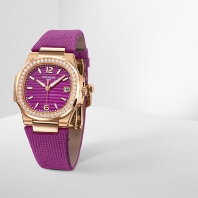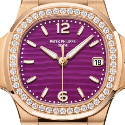 Introducing the Patek Philippe Nautilus 7010R-013, a luxurious and elegantly crafted timepiece that epitomizes sophistication. This exquisite 32mm watch is fashioned from 18k rose gold, reflecting the pinnacle of refined style. The dial, in a stunning lacquered purple, is both vibrant and subtle, set against the shimmer of rose gold applied hour markers and numerals. Each marker is enhanced with a luminescent coating for superior readability under varying lighting conditions. The date display at 3 o’clock is seamlessly integrated, maintaining the dial’s sleek and uncluttered appearance. The bezel is adorned with 46 sparkling diamonds, totaling approximately 0.73 ct, adding a brilliant touch of luxury and making the watch a true statement piece. These meticulously set gems not only elevate the watch’s allure but also showcase Patek Philippe’s commitment to exceptional craftsmanship. Driven by the quartz caliber E 23‑250 S C, this model promises precise and reliable timekeeping, ideal for daily wear. The sapphire-crystal case back provides a glimpse into the flawless engineering that powers the watch. The bracelet, Composite material with fabric pattern. It ensures a comfortable and secure fit with a fold-over clasp, designed for both safety and style.