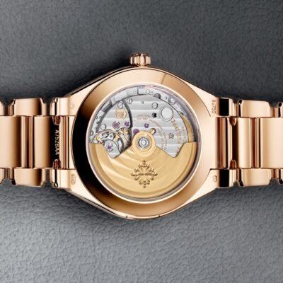 New Patek Philippe Twenty~4 Automatic luxury watch, 36mm, 18k Rose Gold with 160 diamonds ~0,77ct, Ref. 7300/1200R-010. Reliable and modern, feminine and elegant meticulously crafted is truly a sight to behold and a joy to wear. Despite its sophistication, this watch is presented as a casual chic that can be worn every day – a kind of all-rounder. The first model in the collection to feature a round case that is 10.05mm thin yet comfortable and has a modern look on the wrist. The elegant Silver-white dial with double vertical and horizontal satin finish, reminiscent of the texture of wild silk dial along is eye-catching. It features sporty pilot-style 18k Rose Gold Arabic numerals with luminescent coating. The time indicated by large polished luminous nautilus-like (rounded batons) hour and minute 18k Rose Gold hands, ensuring perfect legibility even in the dark. These are complemented by a slim and elegant 18k Rose Gold second hand (Sweep seconds hand). As a classic time and date watch, this model has a date window at 6 o’clock. Thin Rose Gold tone minute markers with 18k Rose Gold squares every 5 minutes run along the outer edge of the dial. A polished 18k Rose Gold crown with a ribbed edge for a comfortable grip and the Patek Philippe logo is the finishing touch to the perfect picture. The dial is covered with a scratch-resistant sapphire crystal. A Sapphire Crystal case back, also made allows you to see the magical workings of the movement. The elegant highlight of model is the fixed sparkling 18k Rose Gold bezel set with 160 diamonds (~0,77ct) flawless. In addition, it is much more complex than just two rows of diamonds surrounding the dial. The bezel follows the curvature of the case and is raised at 12 and 6 o’clock, creating continuity with the bracelet. The model is equipped with a Patek Philippe Caliber 324 S C, with a self-winding mechanical movement containing 29 Jewels, with a power reserve of min. 35 hours – max. 45 hours. This beautiful watch is presented on a seamlessly integrated into the case of the 18k Rose Gold bracelet, and the steps of the links follow the steps of the lugs, giving the watch a more barrel-shaped silhouette. The same applies to the module between the lugs, which follows the shape of the center link. The bracelet are fastens with Patek Philippe’s patented polished 18k Rose Gold folding clasp and engraved with the Calatrava cross. Opening the clasp reveals the engraved Patek Philippe logo with the word GENEVE. Water resistant up to 30m/99ft (3 ATM).