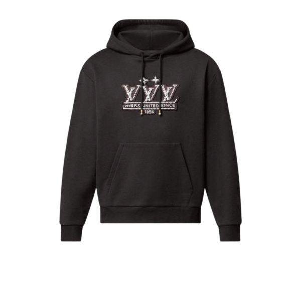 A casual wardrobe essential, this organic cotton hoodie comes in an elegant and versatile dark brown color. This season’s soccer-inspired LV Vers United signature adorns the chest with an embroidered patch embellished with resin pearls. Jewel-like cord ends complete this distinguished style that will elevate any casual outfit.