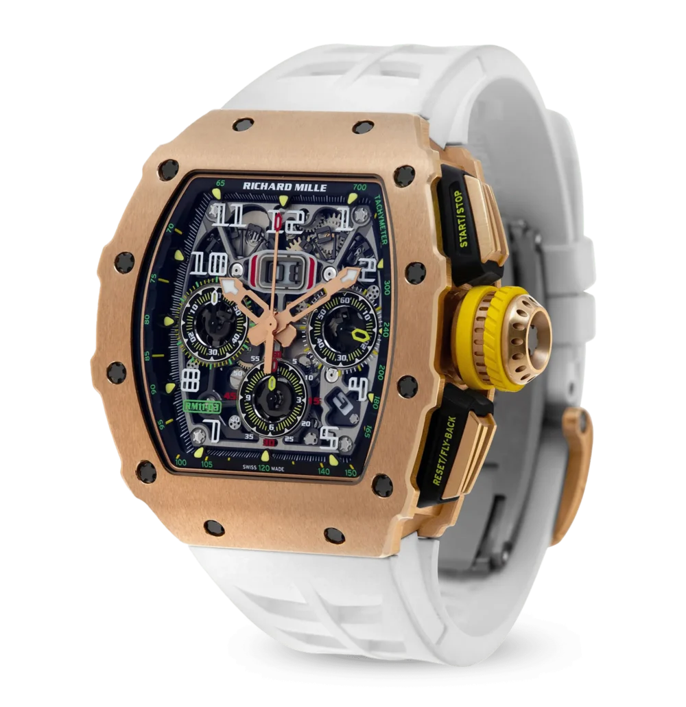 Experience the pinnacle of performance with the Richard Mille RM 11-03 chronograph, an exceptional annual calendar flyback chronograph. Encased in a luxurious rose gold case and styled with a sleek white rubber bracelet with a double deployant clasp, this watch embodies the brand’s signature racing aesthetic with refined sophistication.