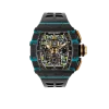 The skeletonized dial is a mesmerizing display of horological mastery, featuring white Arabic numerals and a host of advanced complications. It includes a date window at 12 o’clock, a month display at 4:30, a chronograph hand at the center seconds position, a running seconds subdial at 3 o’clock, a 60-minute and 12-hour subdial at 6 o’clock and a 60-minute countdown timer subdial at 9 o’clock. The transparent design and an exhibition caseback offer a captivating view of the intricate inner workings of the watch, showcasing the harmony of its mechanics. The entire timepiece is water-resistant up to 50 meters.