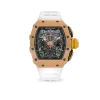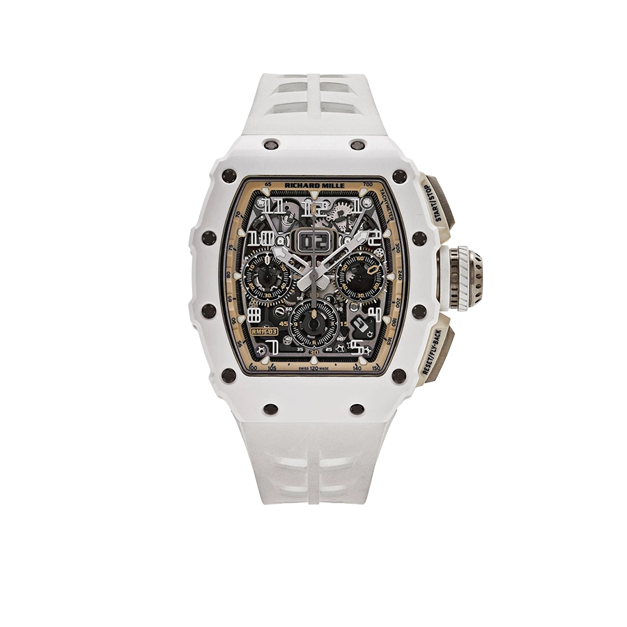 The Richard Mille RM 11-03 is a striking embodiment of cutting-edge design and high-performance engineering. Featuring a bold 50mm case crafted from ultra-lightweight, scratch-resistant white ceramic, this timepiece immediately commands attention. Its skeleton dial offers a clear view into the intricate automatic movement, showcasing complications such as a flyback chronograph, annual calendar, and 60-minute countdown timer. Designed with Richard Mille’s signature tonneau case and technical flair, the RM 11-03 blends avant-garde aesthetics with elite functionality, making it an exceptional choice for those who appreciate innovation in luxury watchmaking.