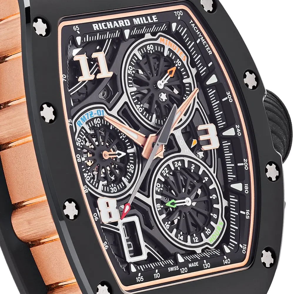 At the heart of the RM 72-01 is the CRMC1 caliber, a flyback chronograph movement developed entirely in-house. This movement features a unique double-tilting pinion clutch system, allowing for seamless operation of the chronograph functions without compromising the timekeeping accuracy. The dial layout includes a 60-minute counter at 2 o’clock, a 24-hour counter at 5 o’clock, and a small seconds subdial at 9 o’clock, all accented with color-coded hands for enhanced legibility. With a 50-hour power reserve and a design that harmonizes form and function, the RM 72-01 stands as a testament to Richard Mille’s innovative spirit and dedication to horological excellence.