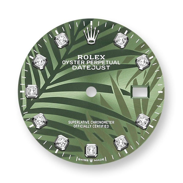 - Dial color: Olive green dial with palm motif and 10 Diamonds as hour markers framed in 18k White Gold