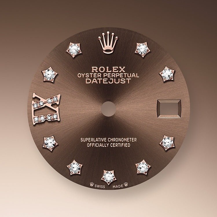 - Dial color: Chocolate dial with a fine sunrays and Nine diamonds set in star-shaped framed in 18k Everose Gold settings and 8 diamonds set in Roman numeral IX framed in 18k Everose Gold