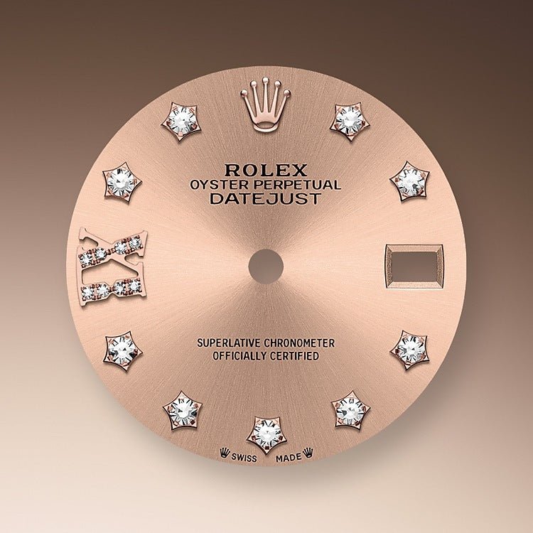 - Dial color: Rosé-colour dial with a fine sunrays and Nine diamonds set in star-shaped framed in 18k Everose Gold settings and 8 diamonds set in Roman numeral IX framed in 18k Everose Gold