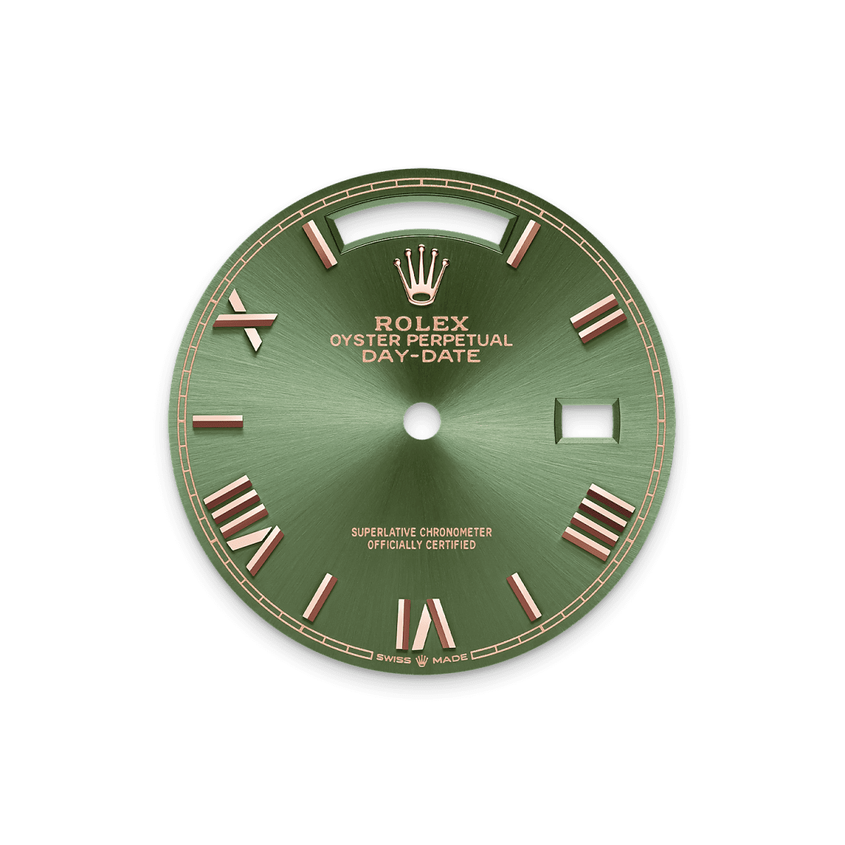 Introducing unworn watch Rolex Day-Date 36, 18k Everose Gold, 36mm, Ref# 128345rbr-0085. Prestigious Day-Date watches remain at the cutting edge of modernity, despite the many decades passing by. As always elegant and luxurious, they are an excellent choice for people who value unique beauty, high style and absolute comfort. New for 2025 in the Rolex Day-Date 36, line is a model with an Olive Green dial sunray finish creates delicate light, with highly legible Chromalight display with long-lasting blue luminescence. Its classic polished 18k Everose Gold Roman numerals and hands made of 18k Everose Gold look amazing on such a dial, emphasizing the sophistication of the model. The date indicator is traditionally placed at the 3 o’clock position. At the 12 o’clock, position is a semi-circular window showing the day of the week in full, providing an instantly recognizable, unique design of Day-Date. A minute scale in the form of a railway track runs along the contour of the dial, which increases the functionality. The ribbed screw-down crown in 18k Everose Gold Triplock with double watertight system, adorned with the Rolex logo, is a traditionally recognizable part of Rolex watches. The dial is covered with a scratch-resistant anti-reflective sapphire crystal and a Cyclops lens above the date with double anti-reflective coating. A solid 18k Everose Gold screw-down case back with fine fluted edges, closes the movement. The flawless bezel of this watch, expertly set with 52 round cut set diamonds, is a testament to the harmonious fusion of craftsmanship and art. Surgically crafted, each precious diamond is set with unwavering precision in a specially prepared bezel housing. The uniform height and flawless alignment of each stone to precise symmetry are a reflection of Rolex’s uncompromising standards. The in-house Rolex mechanical movement, caliber 3255, contains 31 jewels and has an approximate power reserve of approximately 70 hours powers. This delightful timepiece is presented on an 18k Everose Gold President bracelet with semi-circular 3-piece links for flawless beauty. It features Rolex’s original concealed folding Crownclasp to secure the watch on your wrist. Water resistant up to 100m/330ft (10 ATM).