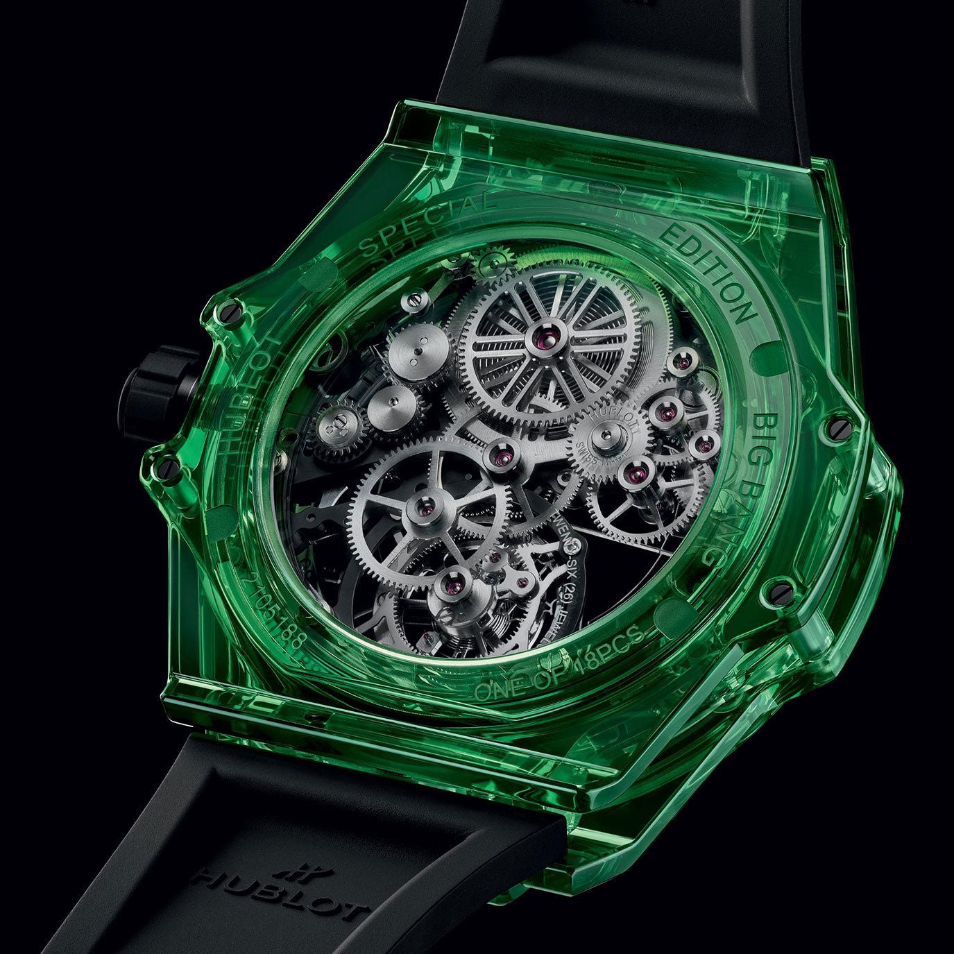 The Hublot Big Bang Tourbillon Automatic Green SAXEM 44 mm is a groundbreaking fusion of advanced materials and high horology. Crafted from SAXEM (Sapphire Aluminium oXide and rare Earth Mineral), the vivid green case offers unmatched brilliance, transparency, and durability—an engineering feat exclusive to Hublot. At its heart is the in-house HUB6035 automatic tourbillon movement, featuring a micro-rotor and a 72-hour power reserve. The fully skeletonized dial reveals the mechanical artistry, placing the tourbillon at 6 o’clock for optimal visibility. Paired with a matching green structured rubber strap and a green ceramic and titanium deployant clasp, this limited-edition masterpiece embodies futuristic watchmaking in its purest form.