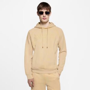 Inspired by effortless summer days, this pale yellow cotton hoodie is perfect for lounging after a dip in the ocean. It is garment-dyed for a washed vintage look and embellished with tone-on-tone embroidered signatures and eyelets. Soft ribbing under the sleeves and down the sides further distinguishes this piece. Matching shorts make a sunny set.